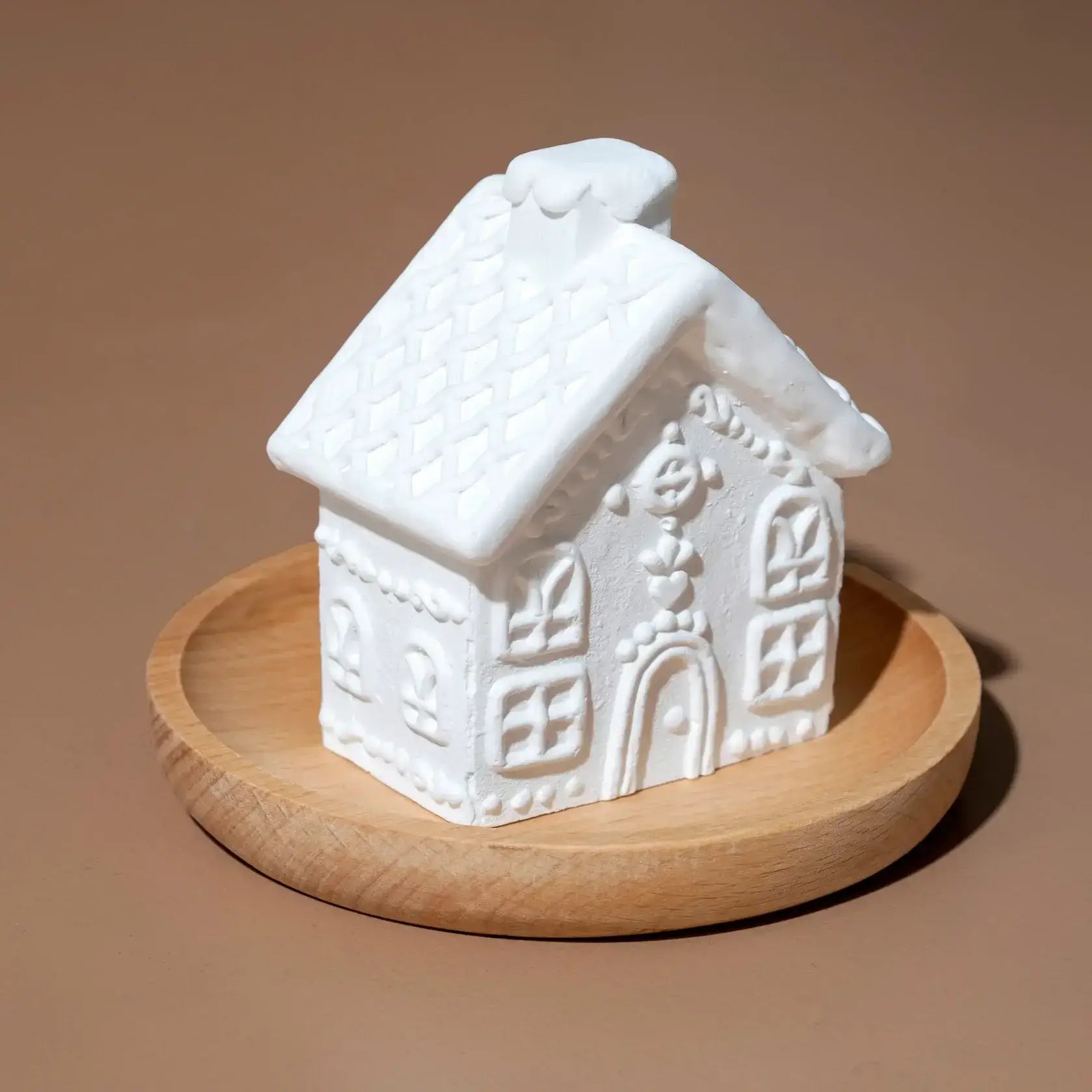 Size: Plaster Gingerbread House (6.3 cm x 4 cm x 7.5 cm); Beech Wood Tray (Ø 10 cm); Approx. 7.05 oz